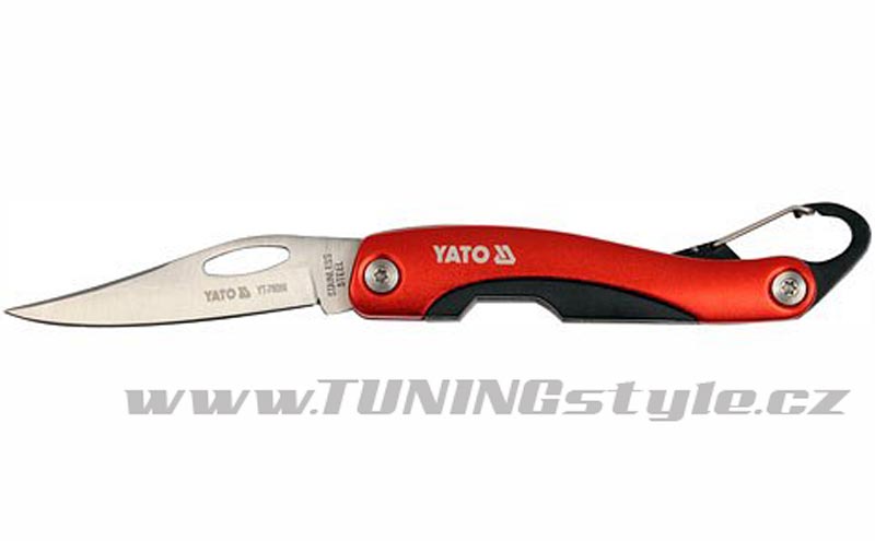 Rukojeť nože je zpracována z eloxovaného hlíníku červené metalické barvy, zakončené karabinkou pro jednoduché uchycení.