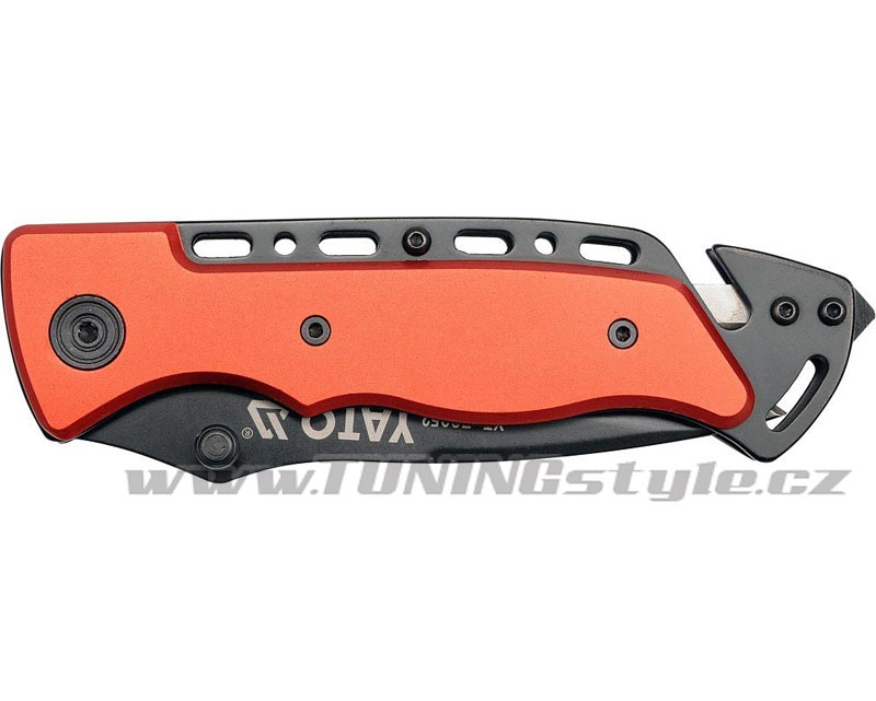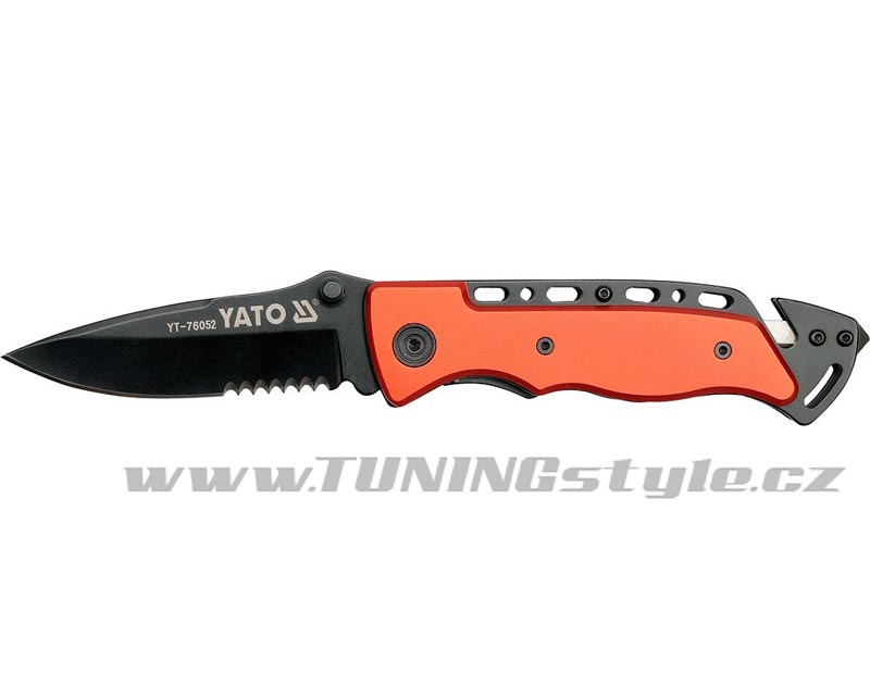 Nůž je určen především pro milovníky nožů a fandy značky Yato. Čepel délky 95 mm je zhotovena z kvalitní nerezové oceli, lakované do matné, černé barvy a je navíc vybavena ozubením na konci ostří. Tvar čepele „drop point“ je nejuniverzálnější lovecká čepel, je vhodná pro porcování masa i stahování kůže, ale díky snížené špičce, lze využít i k bodání.