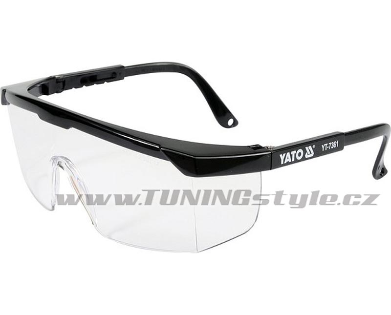 Ochranné brýle z polykarbonátu, s délkově nastavitelnými ramínky, které lze navíc pomocí otvorů na koncích opatřit např. gumičkou pro zavěšení na krk.