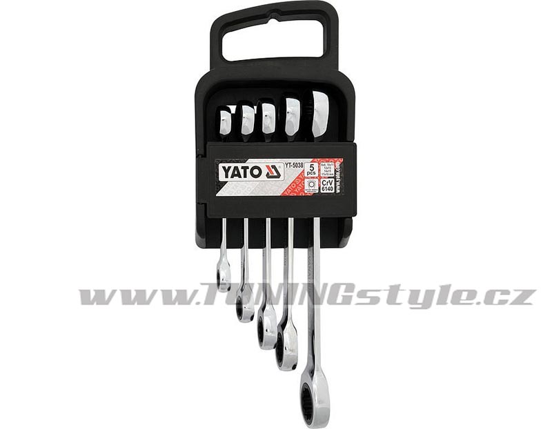 Kvalitní sada očkových klíčů s ráčnou, s jemným dělením 72 zubů• Klíče ráčnové YATO sada 5 kusů očkové 8-19mm• Obsah sady• Klíč 8x9, 10x11,12x13, 14x15, 17x19 mm• Povrch leštěný do vysokého lesku• Chromvanadiová slitina oceli CrV6140 Celý popis