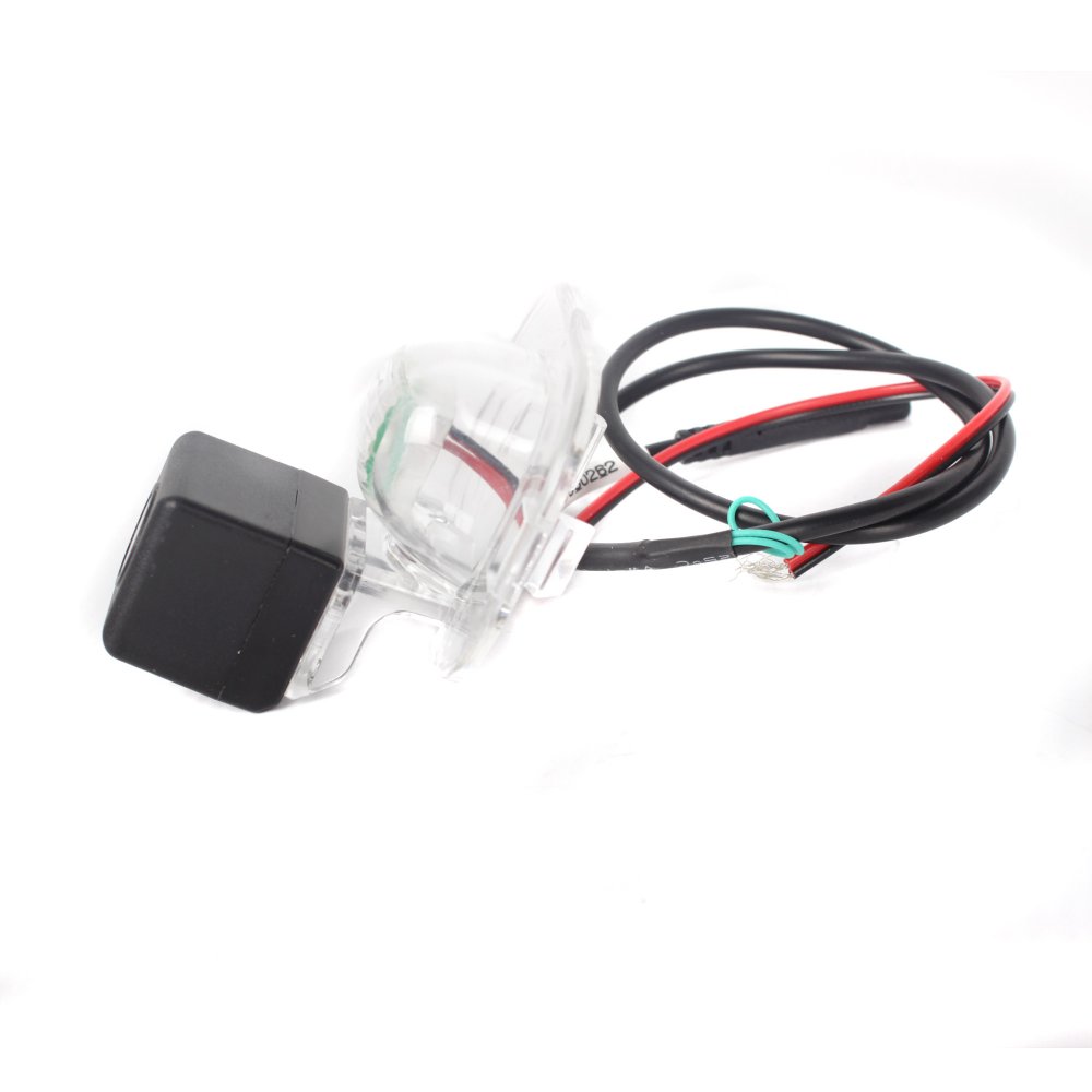 OEM barevná parkovací kamera pro instalaci do lampy pro osvětlení zadní registrační značky. Součástí kamery je LED světlo nahrazující původní osvětlení.
