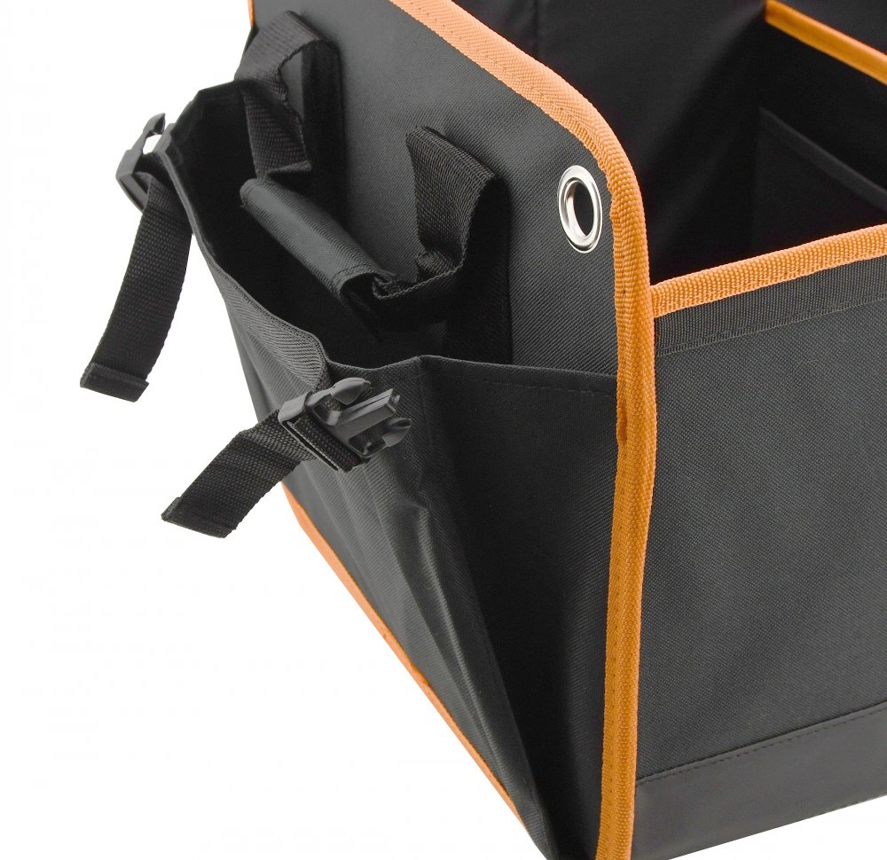 Organizér s rozměry 54 x 34 x 31 cm je zhotoven ze 100% polyesteru, kvalitně obšitého oranžovým lemem.