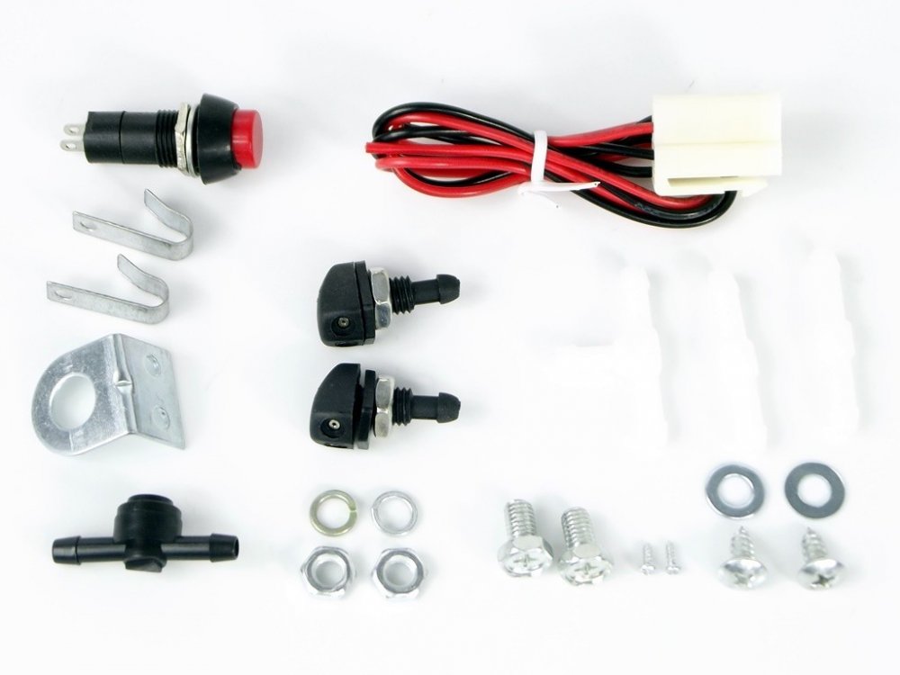 Pracovní režimy: a) fungujou spolu s ostřikem předního skla (po zapnutí ostřikovačů čelního skla) nebo: b) zapnou se pomocí separátního tlačítka (který je součástí balení) Obsah sady: 2 x Tryska ostřikovače Kabeláž Nádržka kapaliny 1 litr (s čerpadlem) Hadičky (délka 7-8 metrů) Matice, podložky atd.