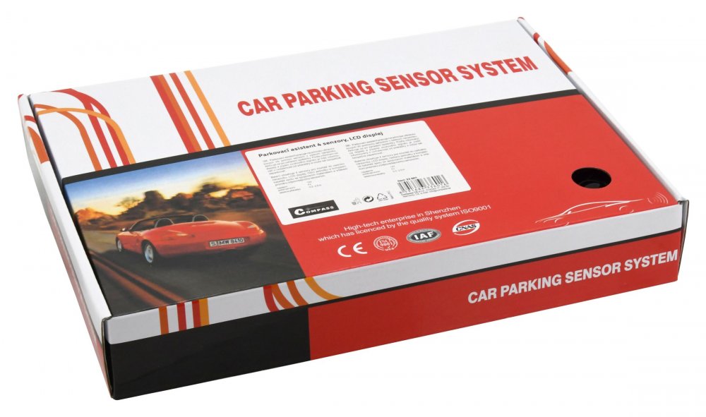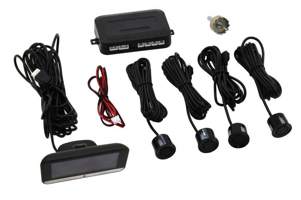 Balení obsahuje displej, řídící jednotku, 4 senzory pro montáž do zadního nárazníku, odpovídající kabeláž a vrták odpovídajícího průměru.