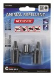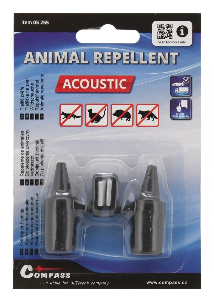 Akustický plašič zvěře, sada 2 kusy. Plašič za jízdy vydává vysoký (lidským uchem neslyšitelný) tón, který dokáže vyplašit zvěř a zábránit tak možné kolizi s ní. Pro instalaci na vozidlo jej stačí pomocí samolepící vrstvy přilepit na jakékoliv místo na přední části vozu, širší částí plašiče směřujíce dopředu. Celý popis