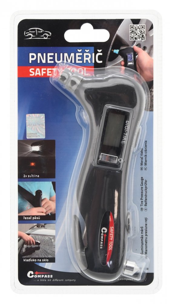 Digitální pneuměřič s celou řadou bezpečnostních doplňků pro nouzové použití např. při dopravní nehodě. Ideální kombinace pomocníků na cesty, doporučujeme vozit stále v autě, například v kapse dveří řidiče. Budete tak mít všechny potřebné nástroje vždy po ruce.