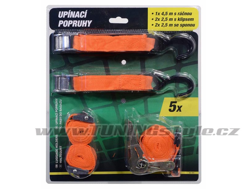 Praktická sada upínacích popruhů, která najde široké uplatnění při upevňování předmětů. Obsahuje jak popruhy s háky, tak smyčky se sponou.Obsah balení:1x popruh s ráčnou a háky, délka 4,5 metru2x popruh s klipsem a háky, délka 2,5 metru2x popruh s klipsem, délka 2,5 metrutechnická data: sada5 ksšířka25 mmbarvaoranžová Celý popis