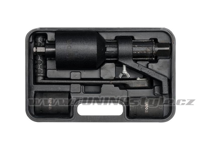 Sada je uložena v kufru, kde se nachází spolu s kovanými nástavci velikosti 32 a 33 mm, je tedy možné použít i pro sundavání kol nákladních automobilů.