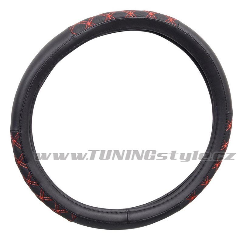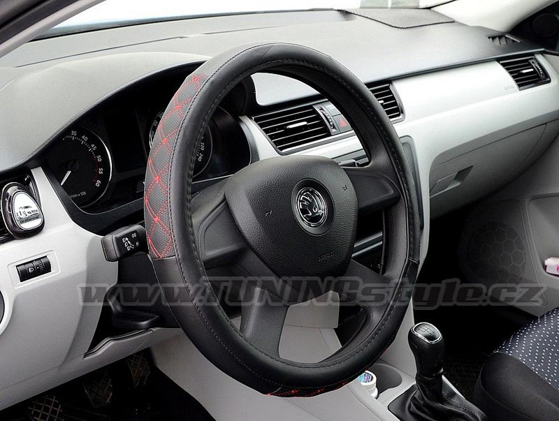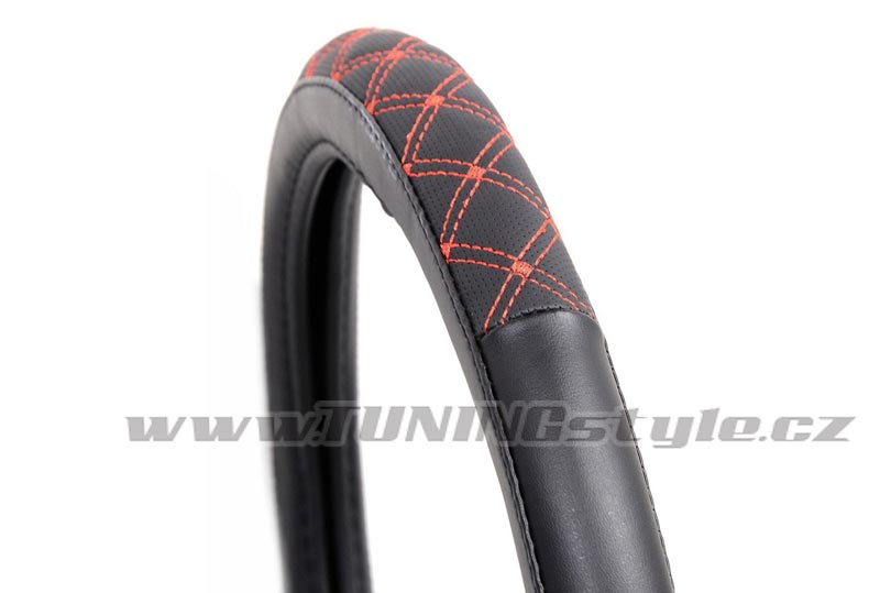 Potah určený k nasazení na volant o průměru 37-39cm.Černé provedení s elegantním vším červených nití. Celý popis