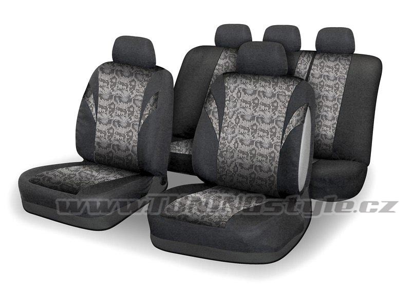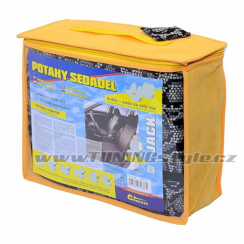 Potahy sedadel "JACK", sada na celý vůz. Potah je vyroben ze zpevněného podšitého materiálu v celé ploše, lze připevnit na většinu běžně používaných automobilových sedadel. Potah lze použít na sedadlech, která mají zabudovaný boční airbag přímo v opěradle předních sedadel. Balení obsahuje potah na přední sedadlo (2x), zadní sedák (celý), zadní opěradlo (pomocí zipu dělitelné na 3 díly), opěrku hlavy (5x). Díky zipům na zadní opěradlová části je možné potahy použít i na vozy s dělenými zadními sedadly a opěradla sklápět bez nutnosti sejmutí potahu.