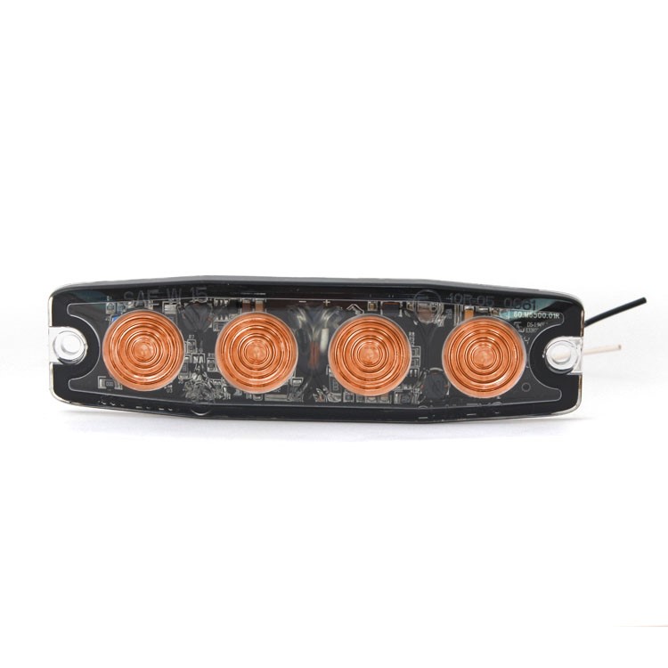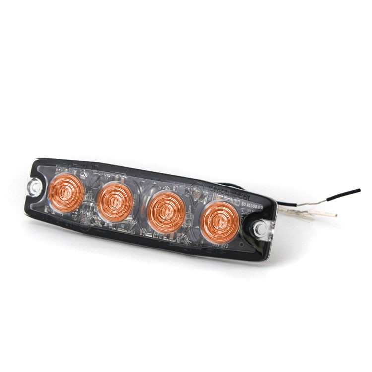 Poziční LED výstražné oranžové světlo do masky v hliníkovém pouzdře, 4x LED, 12 druhů záblesku, 12-24V, R10. Nízkoprofilové (6,6mm) odolné vůči vodě a otřesům.