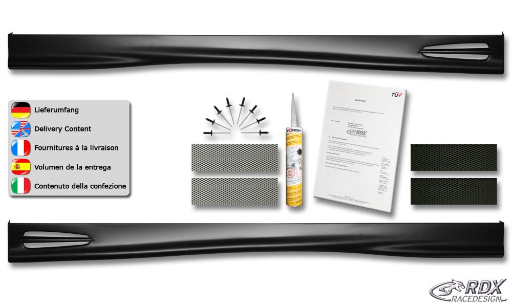 Sada krytů prahů, originál design GT4 RDX Pro všechny verze  Dodáváno včetně certifikátu TÜV Prahy jsou zhotoveny z kvalitního ABS plastu Skvělá povrchová struktura umožňuje snadné lakování (výrobek je dodáván bez laku) Materiál je velmi flexibilní a netříštivý. Montážní materiál je součástí balení (je-li nutný) Instalace lepením a šrouby Cena za pár Celý popis