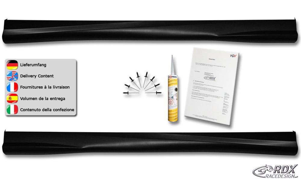 Pro všechny verze  Dodáváno včetně certifikátu TÜV Prahové lišty jsou zhotoveny z kvalitního ABS plastu Dodáváno v lesklé úpravě bez nutnosti lakování (lakování je možné) Materiál je velmi flexibilní a netříštivý. Montážní materiál je součástí balení Instalace lepením Cena za pár Celý popis