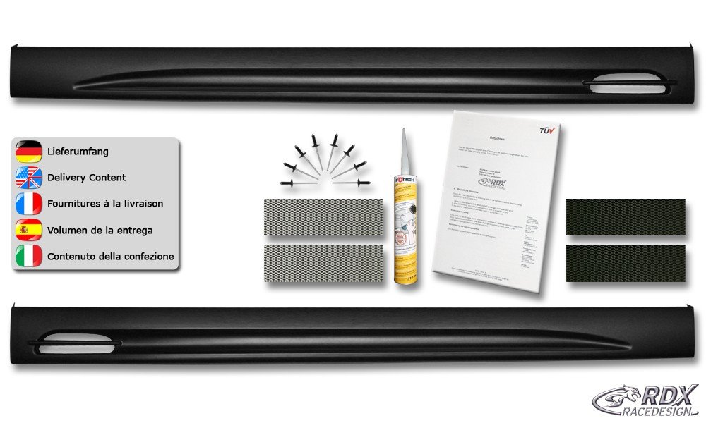 Sada krytů prahů , originál design GT-Race RDX Dodáváno včetně certifikátu TÜV Prahy jsou zhotoveny z kvalitního ABS plastu Skvělá povrchová struktura umožňuje snadné lakování (výrobek je dodáván bez laku) Materiál je velmi flexibilní a netříštivý. Montážní materiál je součástí balení (je-li nutný) Včetně hliníkové mřížky Instalace lepením a šrouby Cena za pár Celý popis