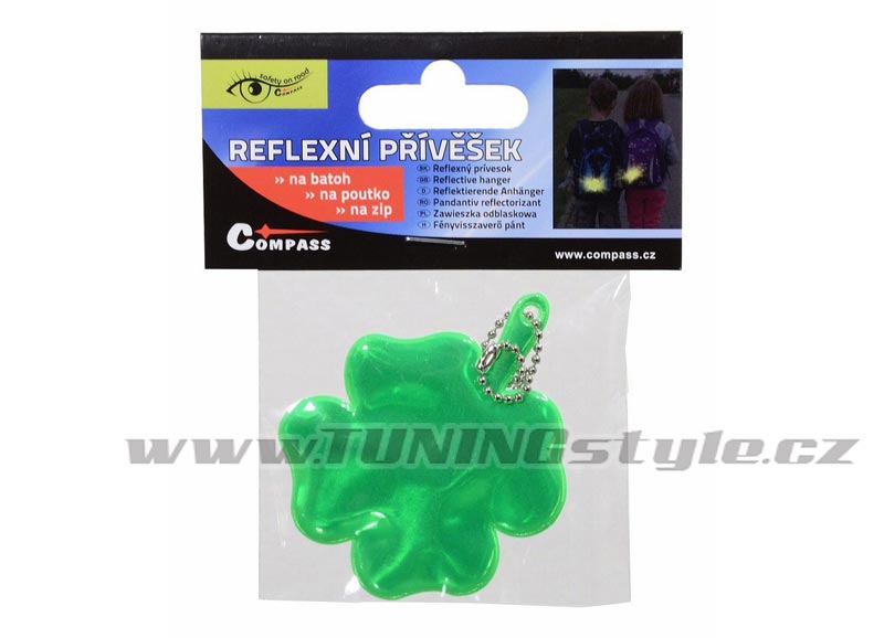Reflexní přívěšek se závěsem, vhodné k upevnění na oděv, na školní brašnu, na batoh, na kapsu, na zip apod.Na velkou vzdálenost dobře viditelný doplněk, vhodné i pro děti. Zejména za snížené viditelnosti či v šeru několikanásobně prodlužuje vzdálenost, na kterou řidič zpozoruje chodce.Leták Reflexní doplňky ke stažení zde (formát PDF)technická data: motivčtyřlístekbarvazelenávelikost6 x 7,5 cm Celý popis