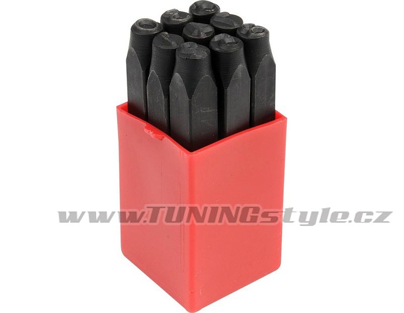 Sada raznic s numerickými znaky 0-9 o velikosti 6mm. Pro číslici 9 se používá otočený razník 6. Jednotlivé raznice jsou zhotoveny z uhlíkaté oceli 1045 s tvrdostí 50-55 HRC. Sada je prakticky uspořádána v plastovém pouzdře. materiál uhlíková ocel 1045 tvrdost (HRC) 50-55 HRC Celý popis