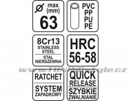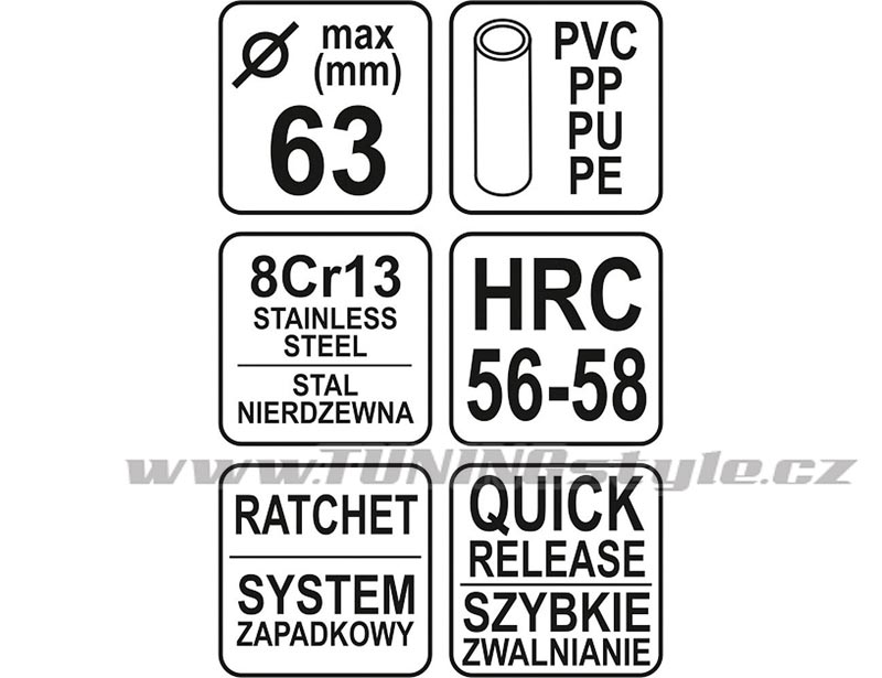 Instalatérské nůžky, pro řezání plastových trubek do průměru 63 mm. Materiál těla je slitina hliníku, břit je z vytvrzené nerezové oceli 8Cr13 s tvrdostí HRC54. Postupný přenos síly je řešen ráčnovým mechanismem. S nůžkami je možné stříhat trubky z PVC / PP / PU / PE a další. Technická data pro trubky plastové do max. 63 mm materiál břitu nerezová ocel 8Cr13 Celý popis