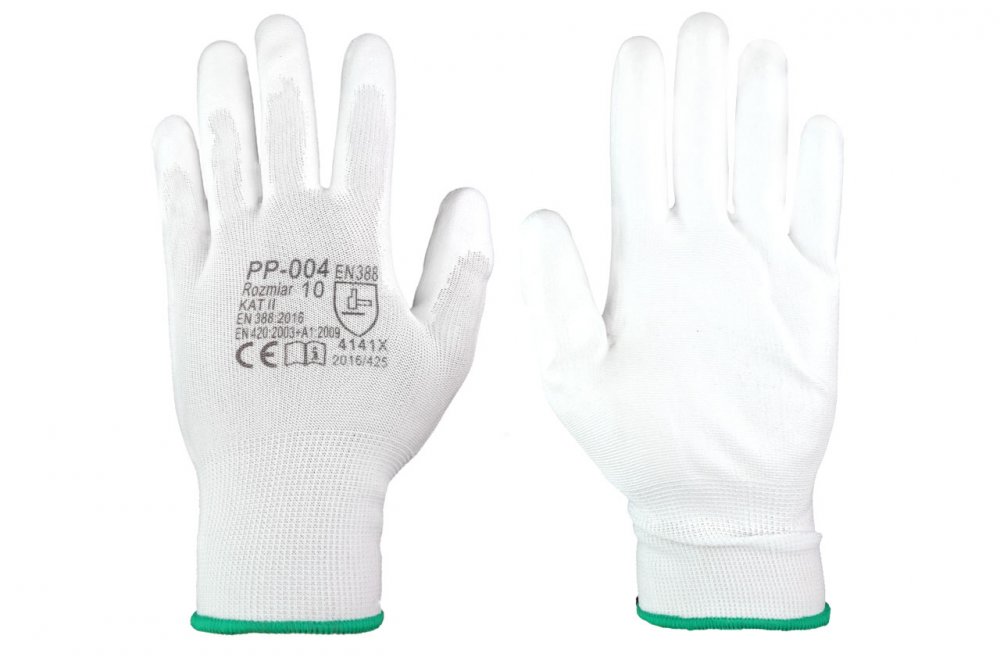 Bílé polyesterové ochranné pracovní rukavice, potažené v oblasti dlaně bílým polyuretanem.