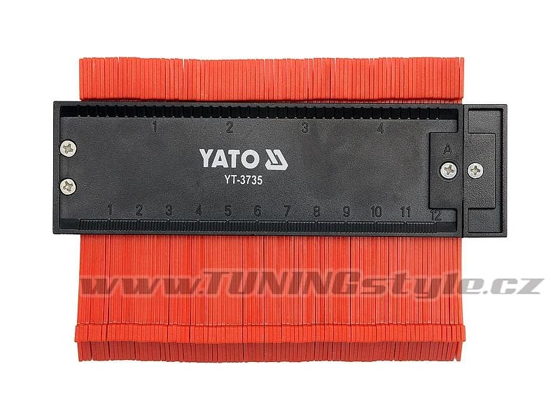 Plastová obrysová šablona šíře 125 mm pro přenášení tvarů profilů předmětů. Praktická pomůcka například pro karosáře. Přiložením lamel šablony k předmětu břity lamel okopírují obrys, který je možno přenést jinam.