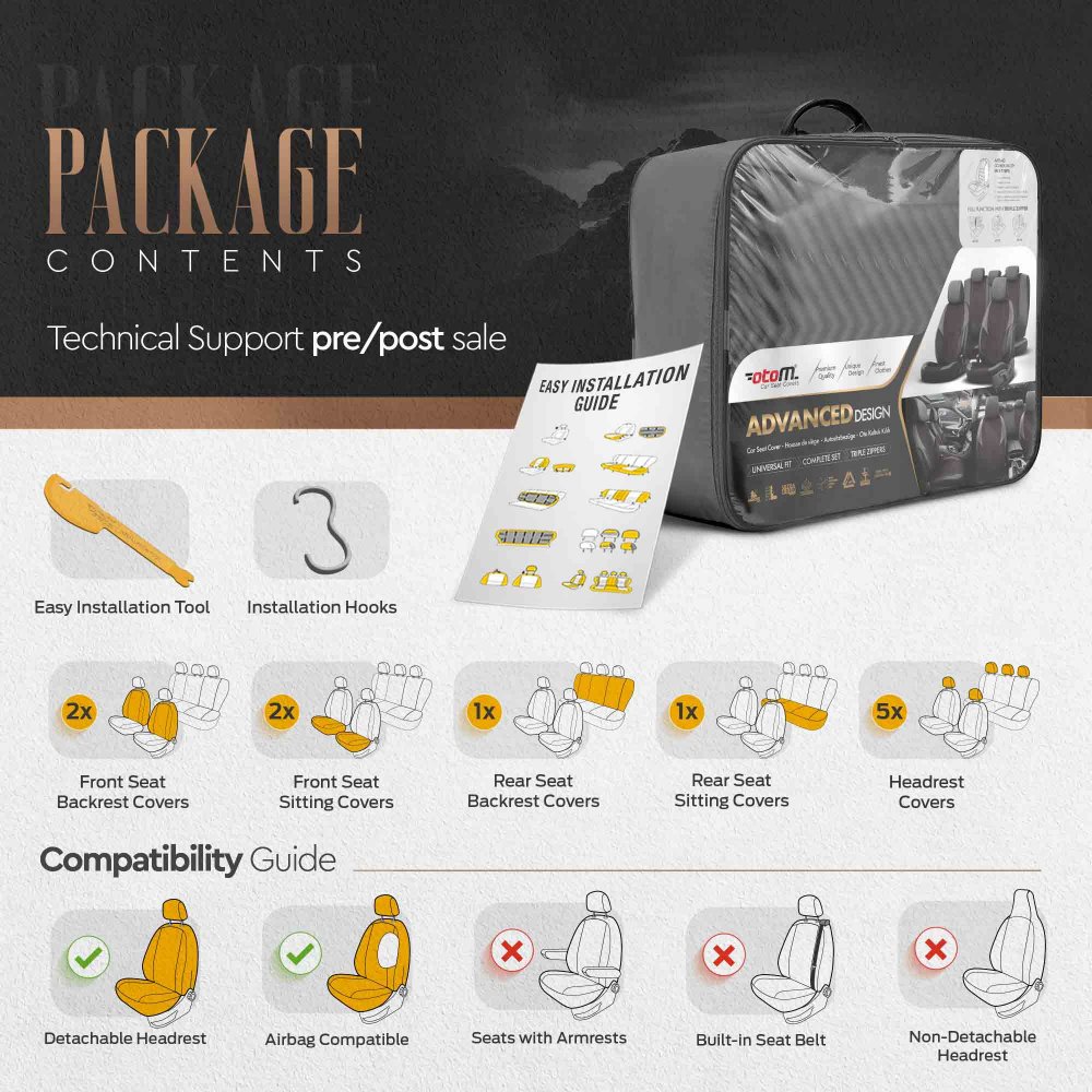 Potahy mají zámky na zadním sedadle, díky čemuž pasují na většinu sedadel dostupných na trhu (nedělené pohovky, dělené vpravo a vlevo).