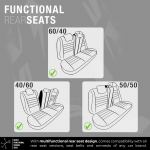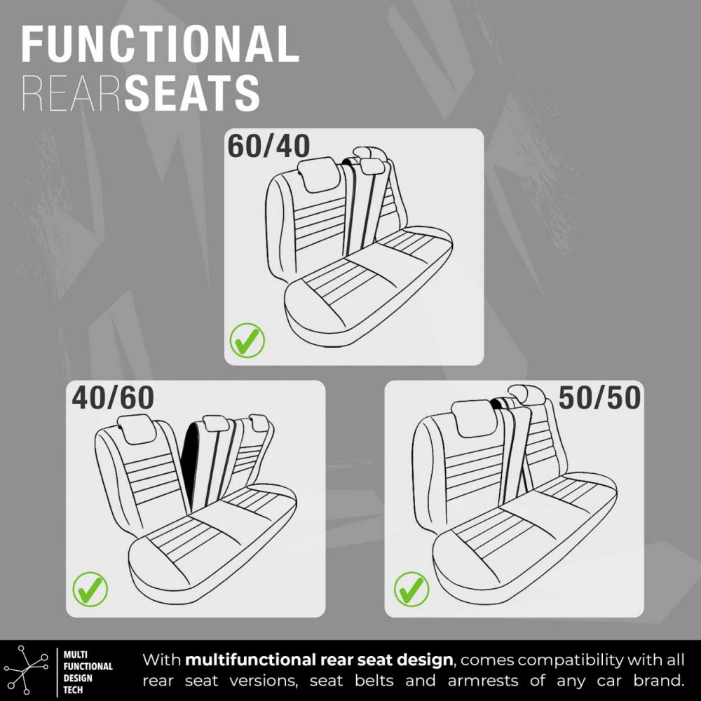 Potahy mají zámky na zadním sedadle, díky čemuž pasují na většinu sedadel dostupných na trhu (nedělené pohovky, dělené vpravo a vlevo).