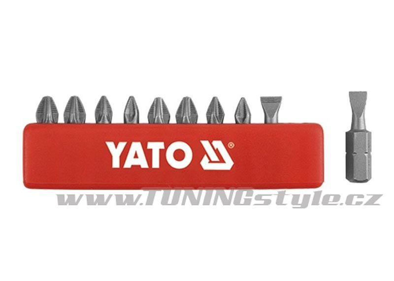 Kvalitní bity Yato se systémem Non-Slip, kdy je hrot bitu vybaven žebrováním zabraňujícím sklouznutí šroubu a zvyšujícím přenos kroutícího momentu. Jednotlivé bity jsou z vysoce kvalitního materiálu AISI S2, s tvrdostí HRC 58 - 62, kované za studena, pro co nejlepší vlastnosti. Maximální kroutící moment 21,8 Nm. Délka bitu 25 mm a jednotlivá zakončení jsou šroubovací, křižové 2x PH1, PH2, PZ1, ... Celý popis