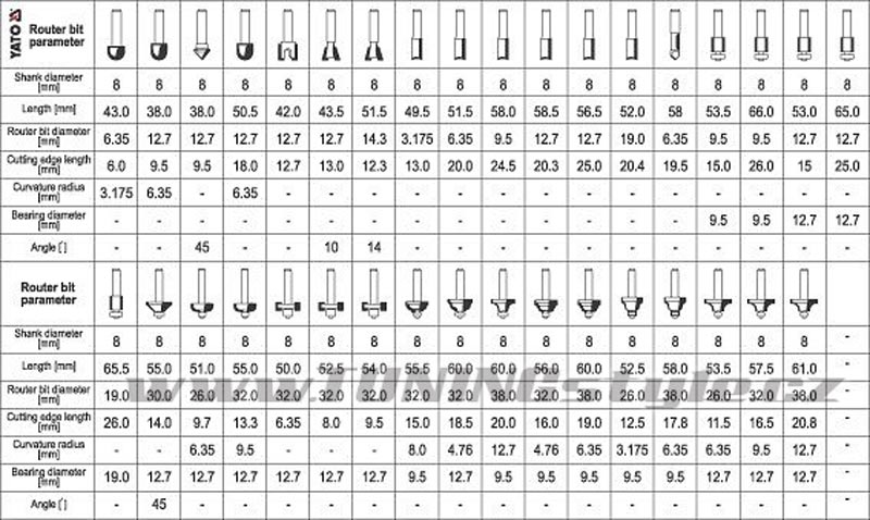 Disponují SK plátky a stopkou o průměru 8 mm. Všechny frézy se navíc pyšní řezacím břitem z tvrdokovu a vodicím kolečkem se spolehlivým ložiskem. Naleznete je navíc v přehledném a odolném kovovém kufru.