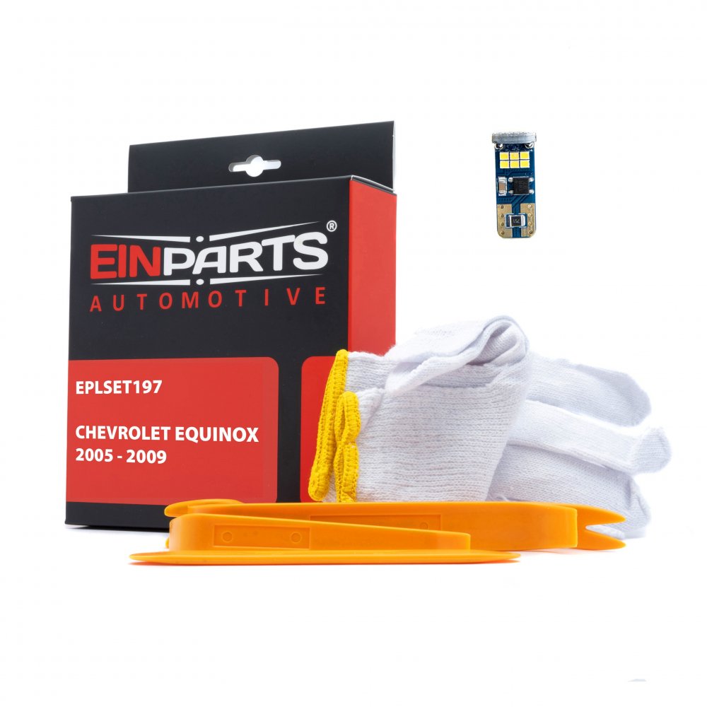 Sada LED žárovek do interiéru CHEVROLET EQUINOX (2005 - 2009) Specifikace: Barva světla: 6000K (studená bílá) Kompatibilita CAN-BUS: Ano, souprava nevyvolává chybové hlášení spálené žárovky Pracovní teploty: -40 °C až +50 °C Použití: 2 x Strop 2 x Strop (vzadu) 1 x Kufr 4 x Sluneční clona/Kosmetické zrcátko Obsah sady: LED žárovky Otvírák Rukavice Celý popis