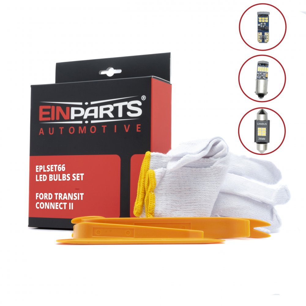 Sada LED žárovek do interiéru FORD TRANSIT CONNECT II Specifikace: Barva světla: 6000K (studená bílá) Kompatibilita CAN-BUS: Ano, souprava nevyvolává chybové hlášení spálené žárovky Pracovní teploty: -40 °C až +50 °C Použití : 8 x Přední/zadní stropní světlo 3 x Osvětlení kufru 1 x Odkládací schránka Obsah sady: LED žárovky Plastové páky na demontáž Rukavice Celý popis