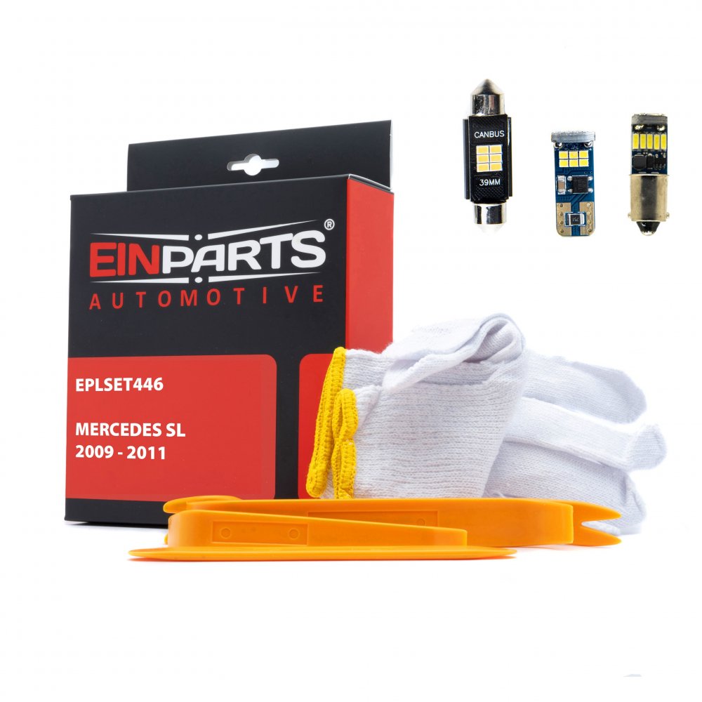 Sada LED žárovek do interiéru MERCEDES SL (2009 - 2011) Specifikace: Barva světla: 6000K (studená bílá) Kompatibilita CAN-BUS: Ano, souprava nevyvolává chybové hlášení spálené žárovky Pracovní teploty: -40 °C až +50 °C Použití: 4 x Strop 4 x Strop (vzadu) 2 x Dveře 4 x Prostor Nohou 1 x Schránka Spolujezdce 2 x Kufr Obsah sady: LED žárovky Otvírák Rukavice Celý popis