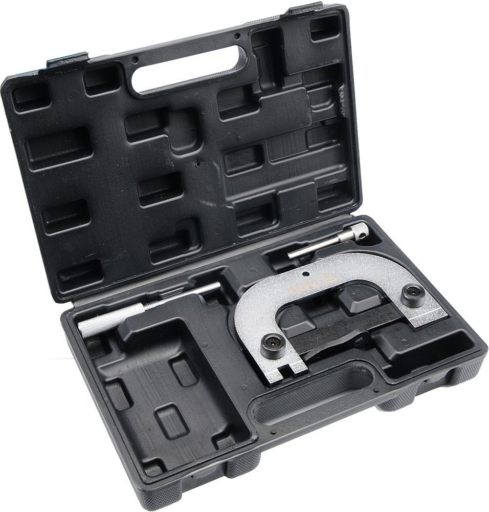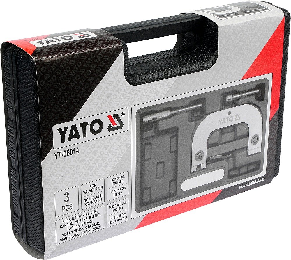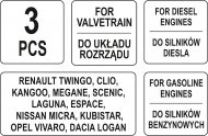 Aretační sada přípravků pro de/montáž rozvodových kol automobilů Renault a Nissan. Sada z uhlíkové oceli, obsahuje 3 prvky určené k blokaci kol. Určení pro spalovací motory: 1,2; 1,4; 1,6; 1,8; 2,0 16 V; 1,5 dCi s kódovým označením motoru: K4J, K4M, F4P, F4R, F5R740, K9K a FR720 Vozy Renault Twingo, Kangoo, Megane, Scenic, Laguna, Espace a Nissan Micra, Kubistar. Celý popis