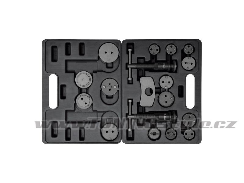 Profesionální sada pro de/montáž kotoučových brzd. Zařízení se skládá z levotočivé i pravotočivé šroubovice a sady desek širokou škálu vozů. Určení pro automobily Citroen, Ford, Mazda, Saab, Alfa Romeo, Honda, General Motors, Nissan, VW, Audi, Rover, Subaru, Paugot, Toyota a další. V sadě se nachází 18 ks součástí pro montáž. Obsahuje levé i pravé nástroje, pomáhá předejít poškození pístu a obl... Celý popis