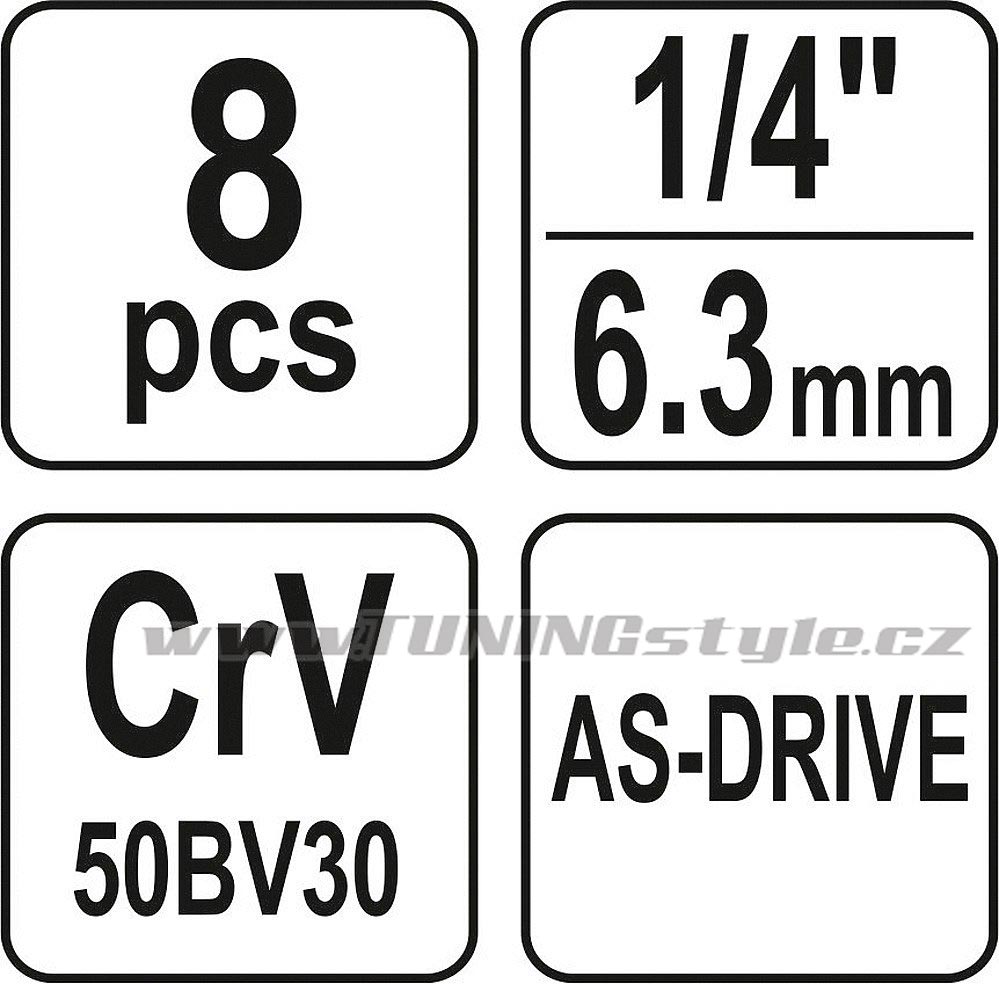 Sada je vybavena systémem AS-DRIVE - vnitřní profil je tvarován do mírného obloučku. Tím při záběru hlavní síla nepůsobí přímo na hranu šroubu, ale na plochu, což významným způsobem snižuje opotřebení šroubu a pomáhá při demontáži již poškozených šroubů.