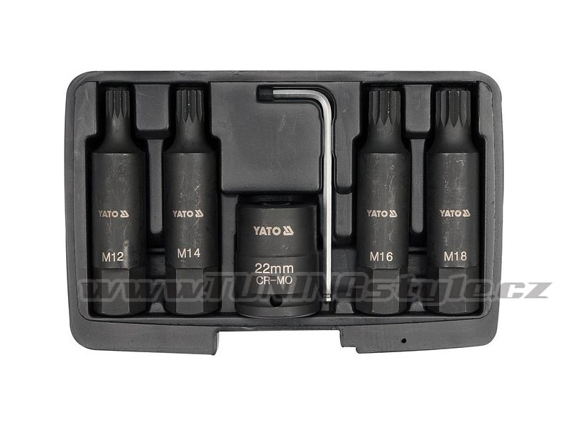 Sada vícezubých bitů spline (XZN) M12, M14, M16, M18 délky 107 mm. Bity jsou ukončeny šestihranem 22 mm a aplikují se pomocí adaptéru 22 mm s vnitřním čtyčhranem 3/4". Vykováno z CrMo oceli SCM-440. délka (mm) 107 rozměr M12 M14 M16 M18 / 22 mm Celý popis