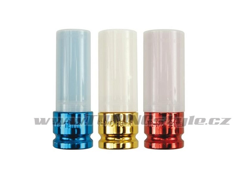 Rázové nástavce pro demontáž a montáž šroubů či matic kol, pro ráčnu 1/2". Zhotovení z chrom-molybdenové oceli SCM-440 s měkkou, plastovou objímku, chránící ráfky před poškozením. Nástavce mají chromovaný povrch, barvený pro snadné a rychlé rozlišení velikosti. Ultra tenké stěny umožňují odšroubování šroubů v těsných hliníkových ráfcích se šrouby, nebo maticemi velikosti 17, 19 nebo 21 mm. Celý popis