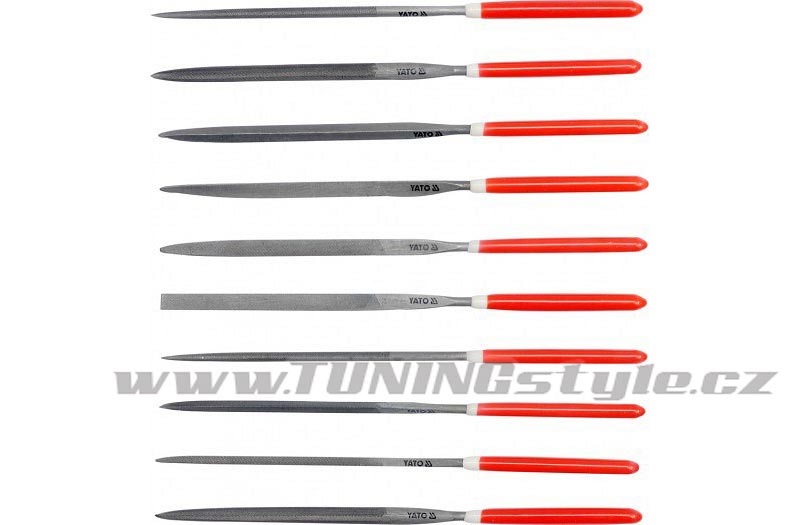 Sada 10 ks pilníků z ložiskové oceli GCR15. Celková délka jednotlivých pilníků 180 mm z nichž brusná část je 85 mm. V sadě je plochý, kruhový, trojúhelníkový, nožový, oválný a další tvary pilníků. délka (mm) 85 (pracovní část) materiál ložisková ocel GCR15 rozměry (mm) 5x180x85 Celý popis
