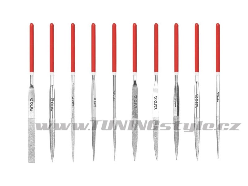 Sada 10 ks diamantových pilníků se zrnitostí 150. Celková délka jednotlivých pilníků 160 mm z nichž brusná část je 50 mm. V sadě je plochý, kruhový, trojúhelníkový, nožový, oválný a další tvary pilníků. celková délka (mm) 160 brusná část 50 zrnitost 150 Celý popis