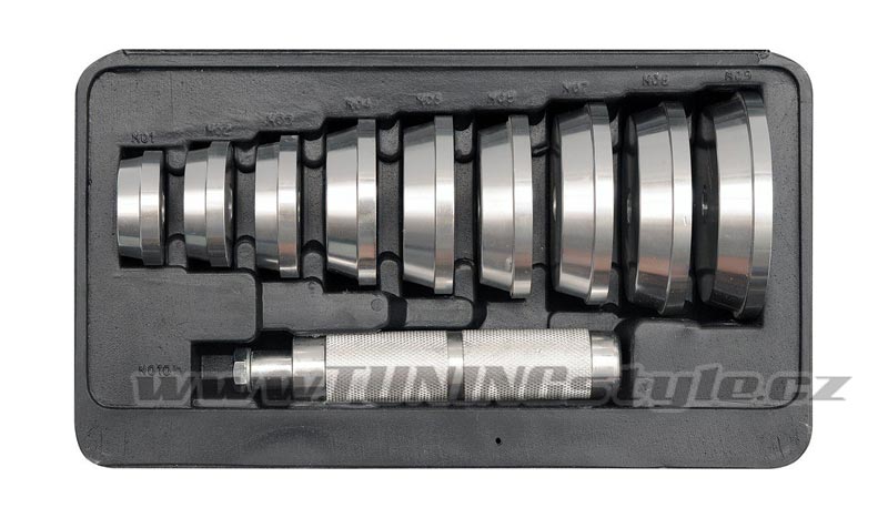 Sada pro motáž těsnících kroužků - simernků neboli gufer. Sada umožní bezpečné vložení těsnícího kroužku s vyloučením jeho poškození.• sada 10 dílů• průměry hlavic 40 / 44 / 50 / 59 / 63 / 65 / 72 / 76 / 81 mm• narážecí rukojeť délka 140 mm• vyrobeno ze slitiny hliníku Celý popis