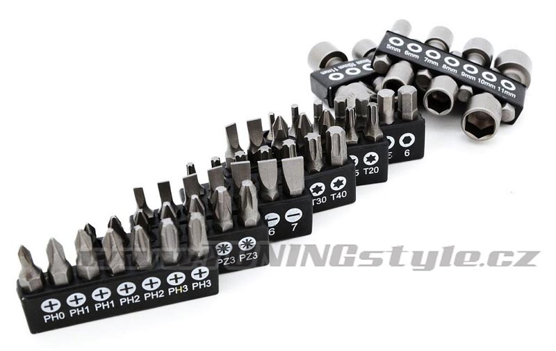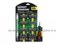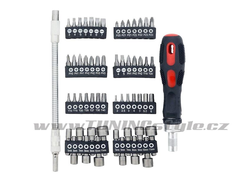 Sada ráčnového šroubováku s ohebným nástavcem a celou řadou bitů. Nejpoužívanější bity jsou v balení vícekrát.