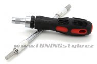 Šroubovák je opatřen protiskluzovým povrchem, který výtečně padne do ruky a usnadňuje šroubování. Ráčnový mechanizmus lze přepínat jak pro utahování, tak i pro povolování.