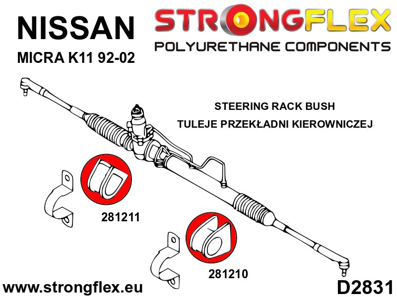 Kód produktu: 281211B Název : Silentblok uchycení řízení Vhodné pro : Nissan Micra K11 (92-02) OEM 48376-4F100 48376-4F111 Počet kusů v balení: 1 Počet potřebných kusů na auto: 1 Materiál: POLYURETHANE (PUR/PU) Ke každému produktu je v balení speciální mazivo. Nezapomeňte namazat všechna místa, kde se polyuretan dotýká kovu! Celý popis
