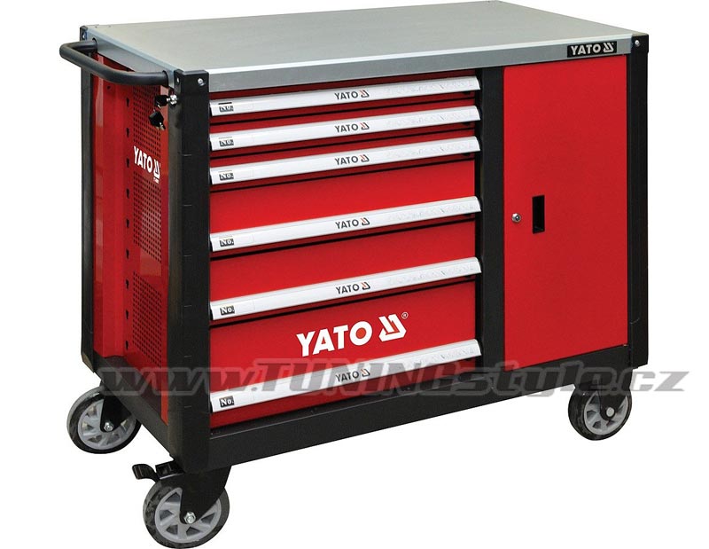 Dílenská skříňka značky YATO, vybavena uzamykatelnou skříní a 6x zásuvkami s kuličkovými ložisky a centrálním zamykáním. Skříňka je vybavena kolečky o průměru 160 mm, jedno kolečko opatřeno brzdou. Horní deska je zhotovena z oleji odolné oceli. Boční strana je perforovaná pro možnost zavěšení příslušenství. Skříň má dvojité stěny a je vybavena rohovými chrániči, které brání nárazu a možnému poš... Celý popis