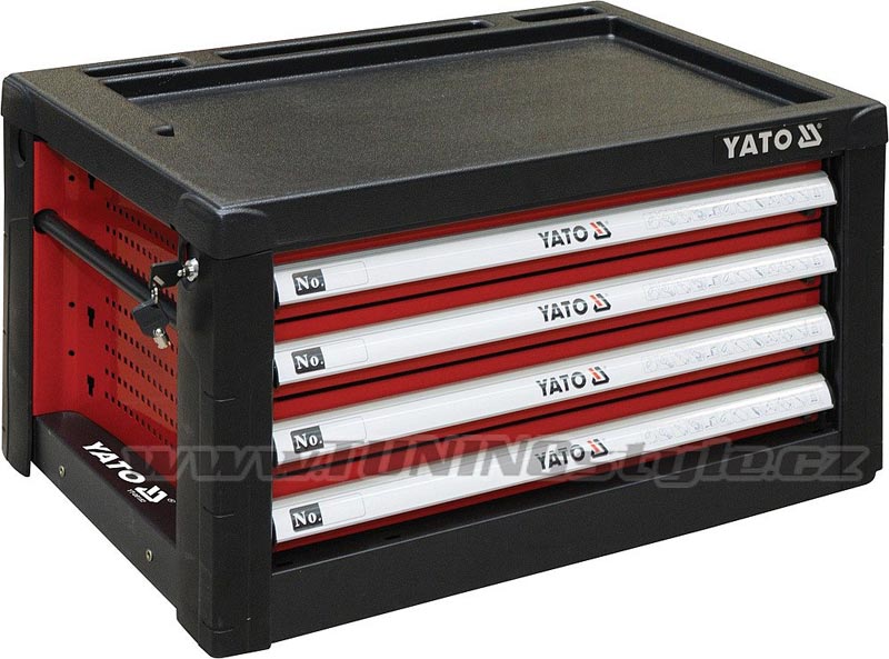 Profesionální dílenská skříň vybavená 4 centrálně uzamykatelnými zásuvkami. Vodítka jednotlivých zásuvek jsou opatřena kuličkami, uzpůsobenými pro velké zatížení. Každá zásuvka má nosnost max. 25kg Skříňka má bytelnou pracovní desku z ABS materiálu. Okraje jsou opatřeny chráničem odolným proti nárazu. Stěny skříně jsou zdvojené a zjedné strany je provedena perforace pro možnost zavěšení nářadí.... Celý popis