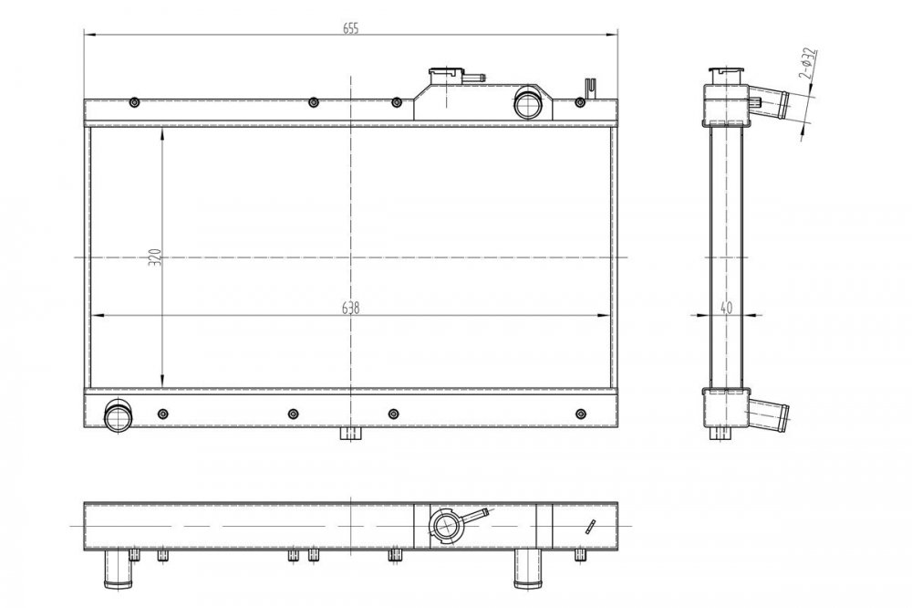 Sportovní chladič vody určený pro: MAZDA MX-5 I (NA) 1.6 1598 B64F 1990.05 - 1994.01 MAZDA MX-5 I (NA) 1.6 1598 8AN1 1995.01 - 1998.04 MAZDA MX-5 I (NA) 1.8 1839 BPF1 1993.09 - 1997.12 MAZDA MX-5 I (NA) 1.8 1840 BP (DOHC), BPF1 1994.02 - 1998.04 Rozměry: Průměr výstupů: 40mm Vzhledem k faktu že daný model má více druhů chladičů prosíme před objednáním porovnat s technickým nákresem, který se n... Celý popis