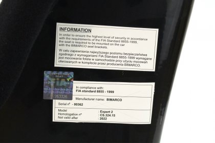 Profesionální sportovní sedačka Bimarco Expert II s homologací FIA. Monolitická konstrukce s vysokou pevností Vyrobená z laminátu a polyesterovo-sleněného materiálu Sedačka připravená pro 4 a 6 bodové pásy Ideální pro jezdce větších rozměrů Homologace FIA 8855-1999 číslo: CS. 057.02 Produkt se prodává bez montážního materiálu a kolejnic. Celý popis