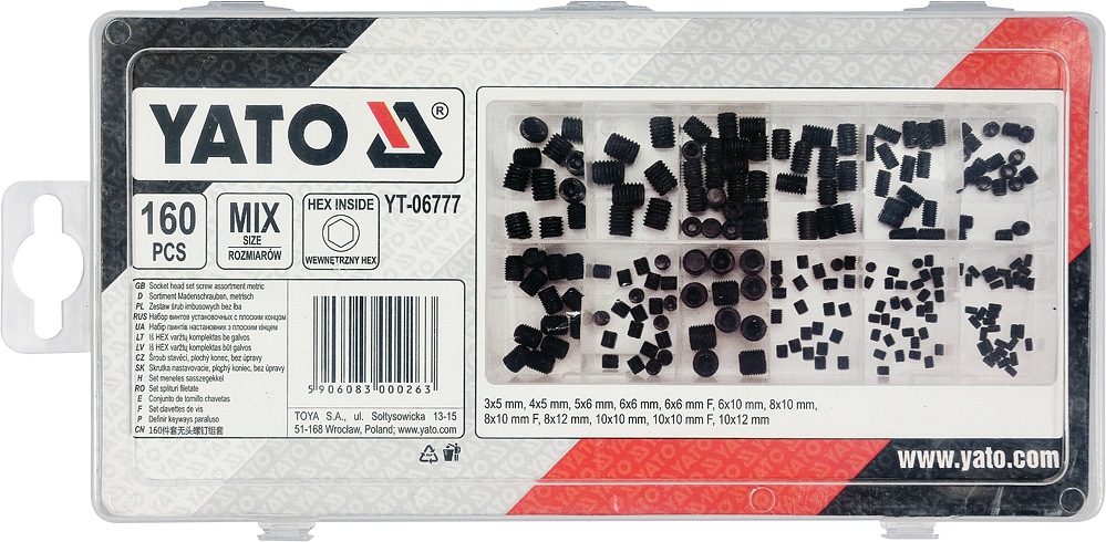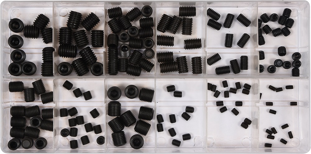 Sada 160 ks bezhlavých, imbusových šroubů. Vše je přehledně uspořádáno v kompaktním plastovém kufříku. Obsah balení 10x 10 x 10 mm 10x 10 x 12 mm 20x 8 x 10 mm 10x 8 x 12 mm 10x 6 x 10 mm 20x 6 x 6 mm 15x 8 x 10 mm F 15x 6 x 6 mm F 10x 10 x 10 mm F 10x 5 x 6 mm 15x 4 x 5 mm 15x 3 x 5 mm Celý popis