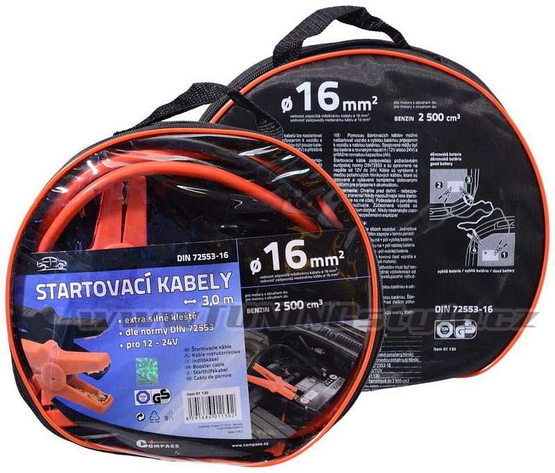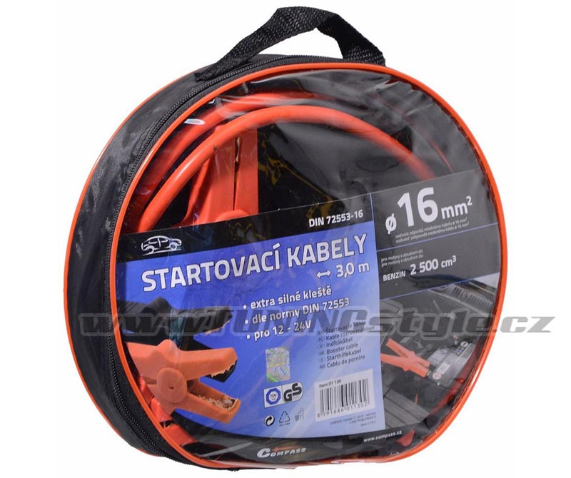 Tyto startovací kabely jsou určeny pro nouzové startování vozidel s benzinovým motorem do objemu 2500 cm3. Délka 3 metry, vodivostí odpovídá měděnému kabelu o průměru 16 mm2.