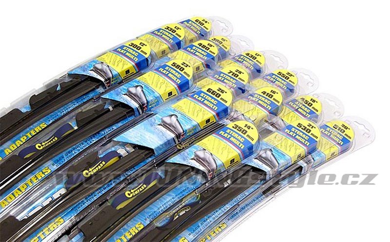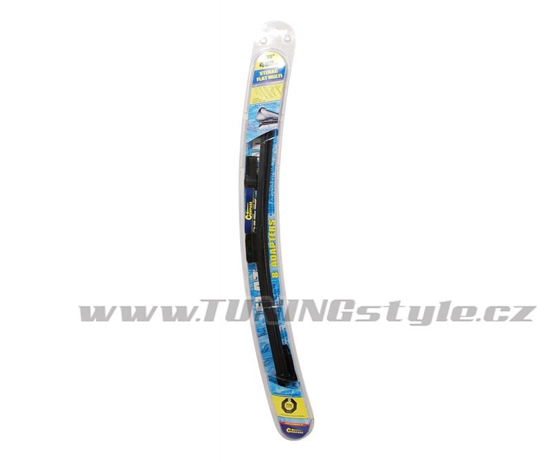 Plochý stěrač nové konstrukce, který zajišťuje důkladné a rovnoměrné stírání. Speciální uchycení, díky kterému lze pomocí přiložených adaptérů použít tento stěrač pro řadu různých zakončení ramen stěračů. Balení á 1 ks ve speciálním "otevíracím" blisteru. Tento typ plochého stěrače je osazen gumičkou s černým grafitem, umožňuje i její výměnu.