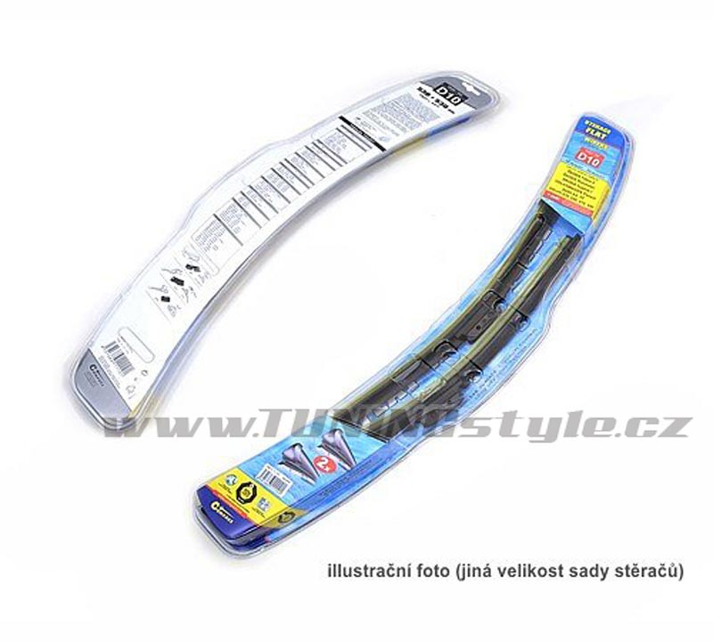 Sady dvou plochých stěračů FLAT (řidič + spolujezdec) s řadou adaptérů pro různá zakončení ramen stěračů.