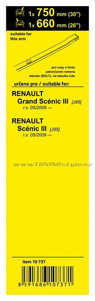 Sada dvou plochých stěračů FLAT (řidič + spolujezdec) se speciálním uchycením. Délky stěračů a systém uchycení na ramínko jsou přizpůsobeny vybraným vozům (viz tabulka použití).Vysoce kvalitní pružný člen plochého stěrače zajišťuje stejnoměrný tlak grafitového břitu v celé jeho délce, což zamezuje rozmazávání nečistot a vytváření pruhů.určeno pro vozy:značkarok výrobyRenault Grand Scénic III [J... Celý popis